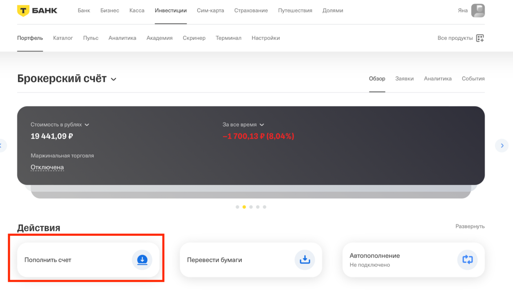 Кликнуть на нужный брокерский счет в списке и выбрать «Пополнить счет»