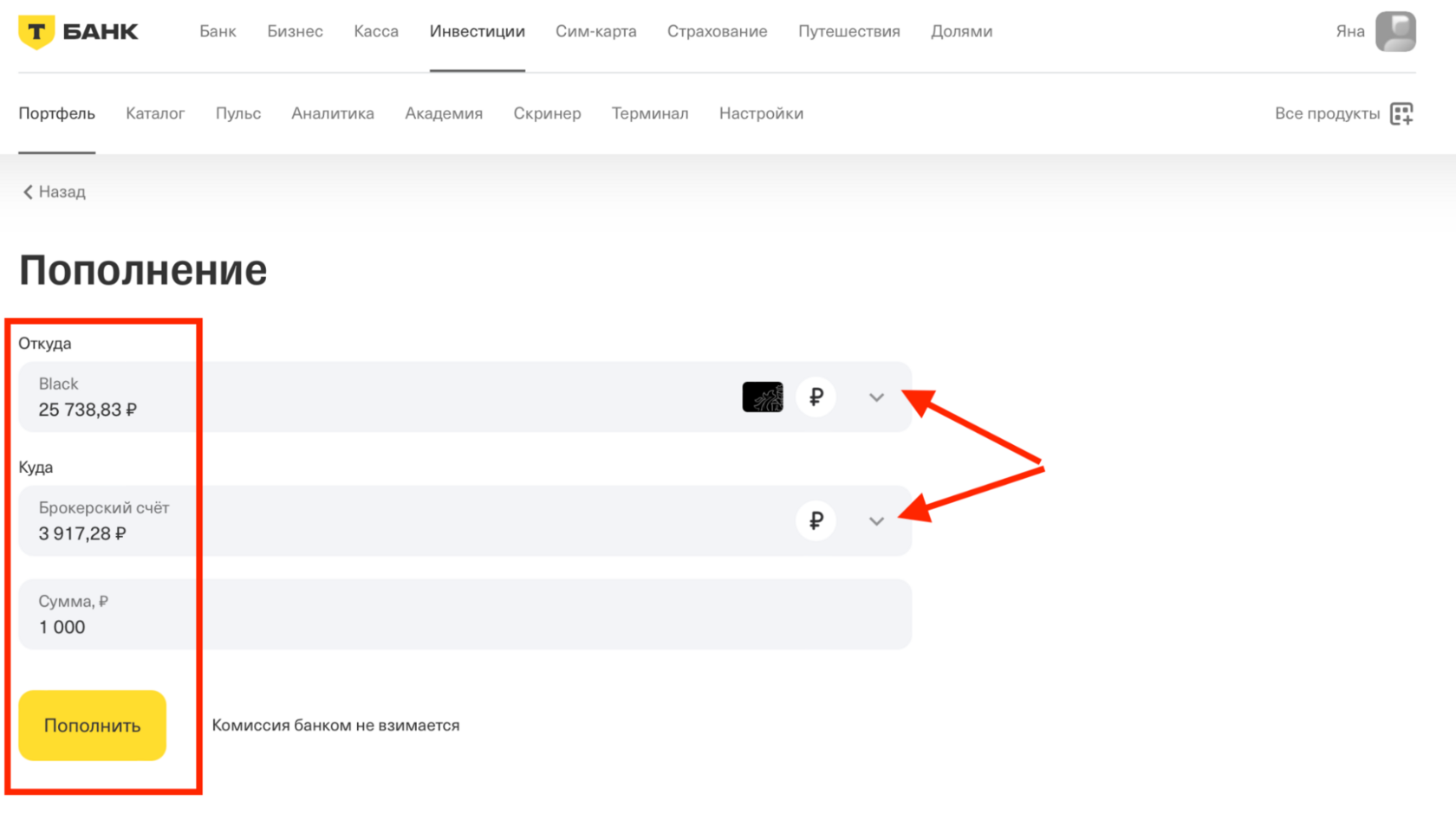 Брокер не берёт комиссию за пополнение брокерского счета любым способом.